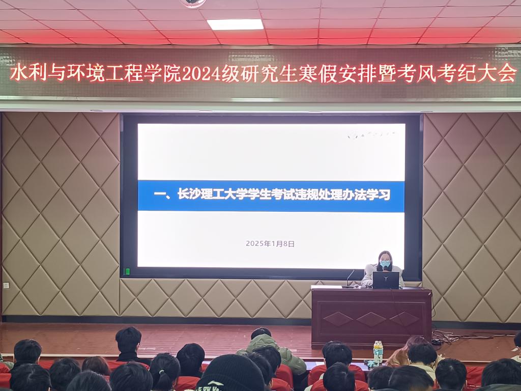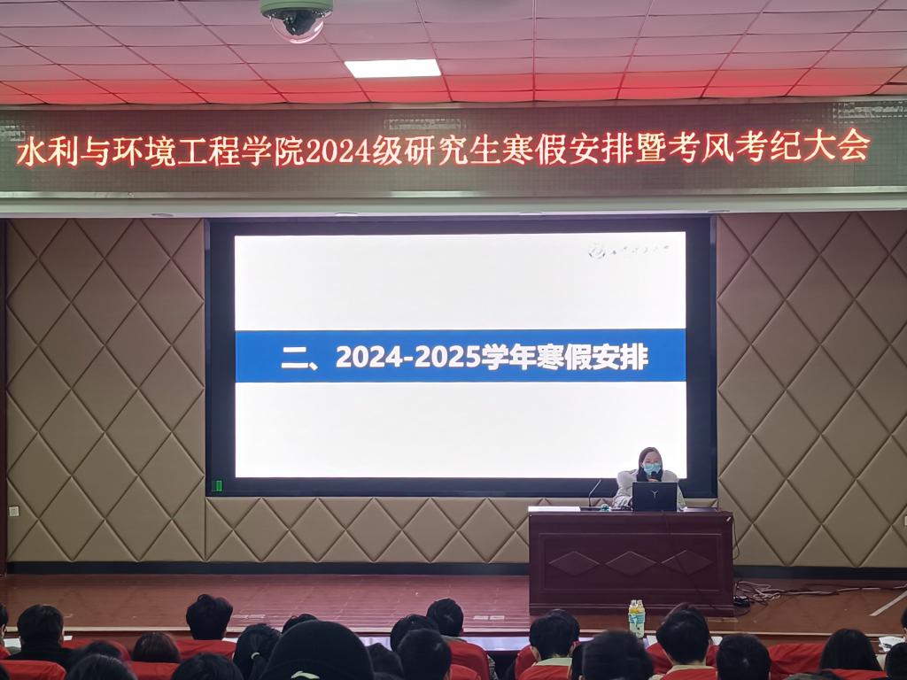 为加强研究生考风考纪教育和安全意识,1月8日上午10:30,水利学院在文科楼A200召开2024级研究生寒假安全教育暨考风考纪教育大会。会议由学院研究生辅导员杜丘主持,全体24级研究生参加。