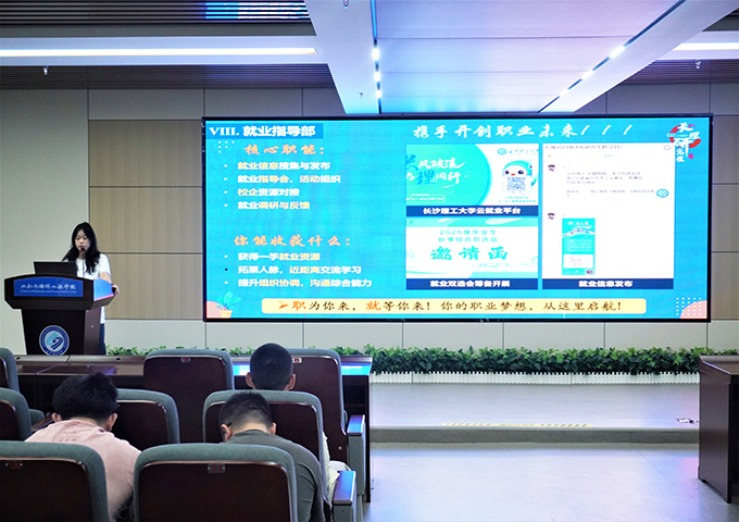 在研究生会宣讲会上,各部门负责人依次上台进行介绍,围绕部门职能、品牌活动、招新需求等方面展开详细讲解。敖田介绍到,作为连接学校、学院与研究生群体的重要桥梁,院研究生会始终以“服务同学、引领成长”为核心目标,致力于为广大研究生打造学术交流、文体活动、权益保障等多维度的发展空间。同时,她鼓励新生们积极加入,在研究生会的平台上锻炼能力、结交伙伴,共同为校园文化建设贡献力量。