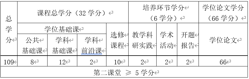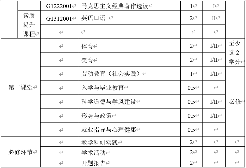 注:①选修课程中至少开设一门学科前沿课。②学生至少获得第二课堂5学分方可毕业。第二课堂活动学分认定见《威廉体育williamhill研究生第二课堂学分管理办法》。其中,体育和美育类课程一共2学分,劳动教育(社会实践)1学分,科学道德与学风建设0.5学分,形势与政策0.5学分,入学教育0.5学分,就业指导与心理健康0.5学分。