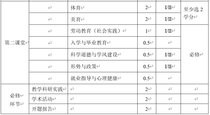 2.学生至少获得第二课堂5学分方可毕业。第二课堂活动学分认定见《威廉体育williamhill研究生第二课堂学分管理办法》。其中,体育和美育类课程一共2学分,劳动教育(社会实践)1学分,科学道德与学风建设0.5学分,形势与政策0.5学分,入学教育0.5学分,就业指导与心理健康0.5学分。