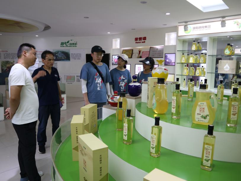 油茶产业“不与粮争地,不与地争肥”,是值得大力推广的乡村振兴产业。浏阳市镇头镇拥有全省唯一连片的10万亩油茶林,打造集金霞油茶、油茶博物馆、油茶花开广场、油茶文化街于一体的“油茶小镇”底气十足。实践团成员走入镇头镇金健茶油生产基地,生产主管杨继文耐心讲解车间工艺流程和设备原理,从实现自动化控制的冷榨车间、油脂精炼车间,到智慧包装车间,再到品质控制室,实践团成员见识到实验室小试装置的工艺步骤转化为工业化生产的连续机械运转,纷纷感叹“我们研究生不能止步于科学真理探索,更要把安全、健康、美味的食品实现产业化、数字化、智慧化生产”。