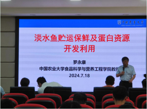 报告会上,罗永康教授重点介绍了其课题组在淡水鱼贮运保鲜及蛋白资源开发利用的系列研究,从生鲜鱼肉贮运过程菌群结构变化、腐败菌对鱼肉品质的影响及控制、多组学预测生鲜鱼贮运过程品质等方面解析了淡水鱼冷链贮运过程品质变化规律与控制技术;并就淡水鱼蛋白资源的开发利用现状、技术难点、成果转化、应用前景做了分享。