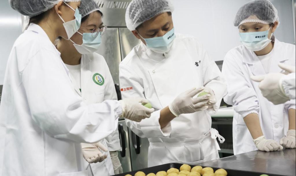 从精心设计月饼造型,创新调制月饼馅料,并向拥有二十多年烘焙经验的大师虚心请教,研究生同学们在传承与创新的交汇中赋予每一枚月饼独特的印记。经过一套完整的烘焙流程,这些亲手制作的月饼将会发放给食品学院刚入学的69名研究生新生,一解研究生新生的思乡之情。