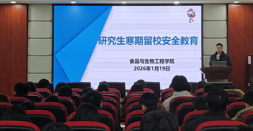 为加强寒假期间留校研究生的安全管理,确保科研学习顺利开展,2026119日下午,食品与生物工程学院在工科楼A320召开寒假留校研究生安全教育大会。会议由研究生辅导员祝孟豪主持,全体留校研究生参加。