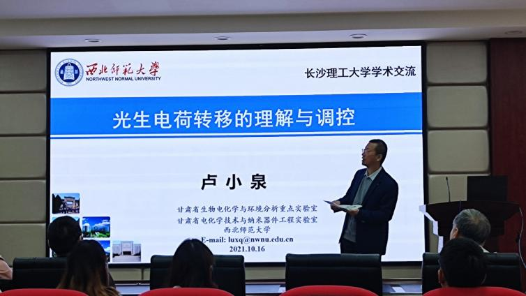 2021年10月16日上午9:00,应威廉体育williamhill化学化工学院的邀请,教育部长江学者特聘教授、西北师范大学博士生导师卢小泉教授来我校开展学术交流,于云塘校区工三A320做了题为“光生电荷转移的理解与调控”的专题学术报告。讲座由化学化工学院电力与交通材料保护湖南省重点实验室主任曹忠教授主持,化学化工等专业百余名师生参加了交流会。