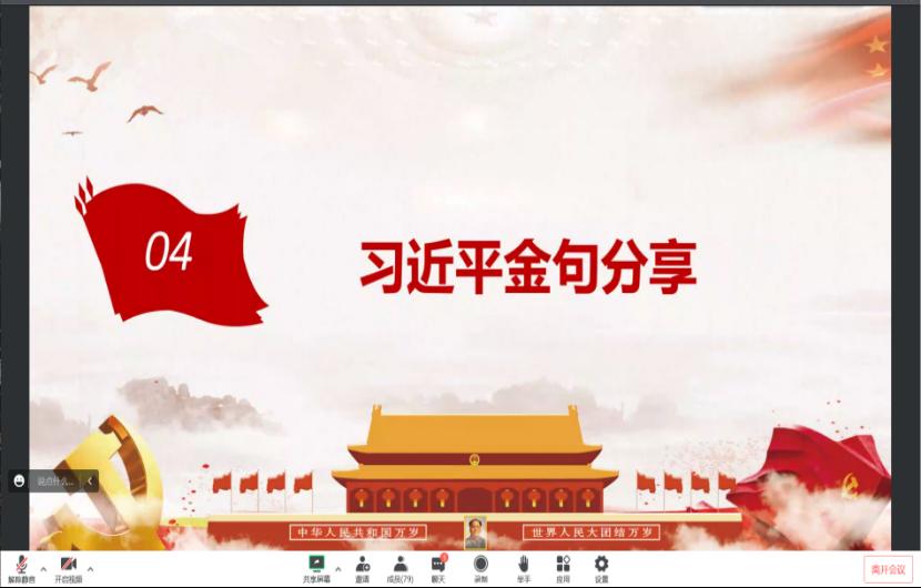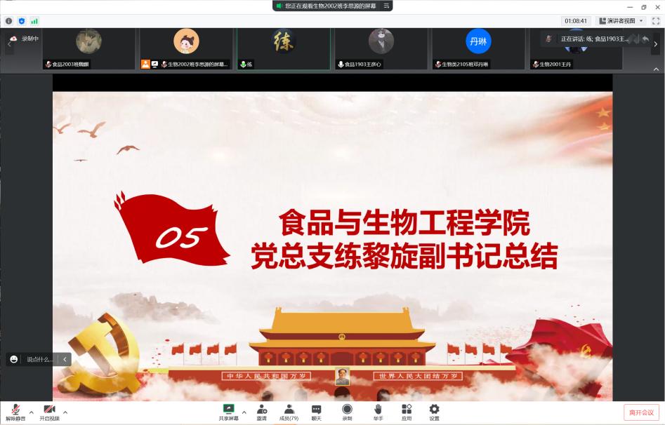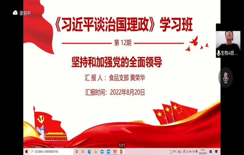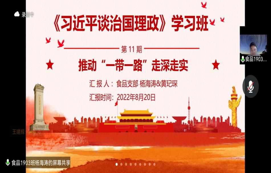 2022年8月20日,威廉体育williamhill食品与生物工程学院食品本科生党支部在腾讯会议举办《习近平谈治国理政》读书班第六次读书分享会。食品学院党总支书记王建辉、党总支副书记练黎旋、学工办老师胡佳佳等师生近100余人参加此次活动。