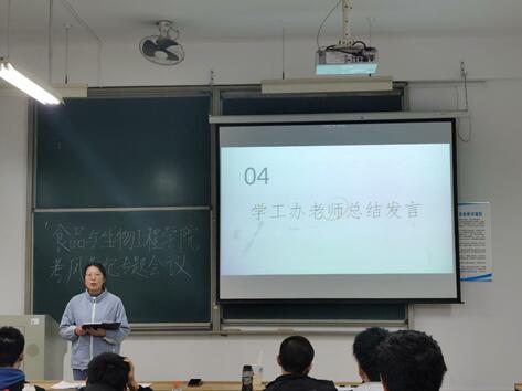 为严肃考风考纪,加强诚信教育,培养学生的诚信品德,营造公平、公正、诚实守信的考试氛围,食品学院于12月6日晚7:00,在工科三楼A217召开考风考纪教育大会。参与此次会议的有学工办王凤,院学生会学习部学生干部,各班班长和学习委员,会议由学习部卢文奕主持。