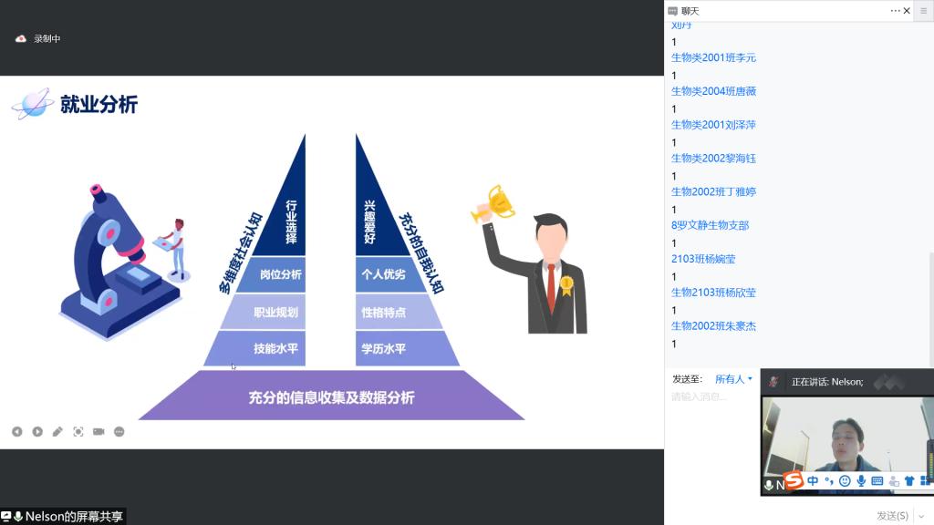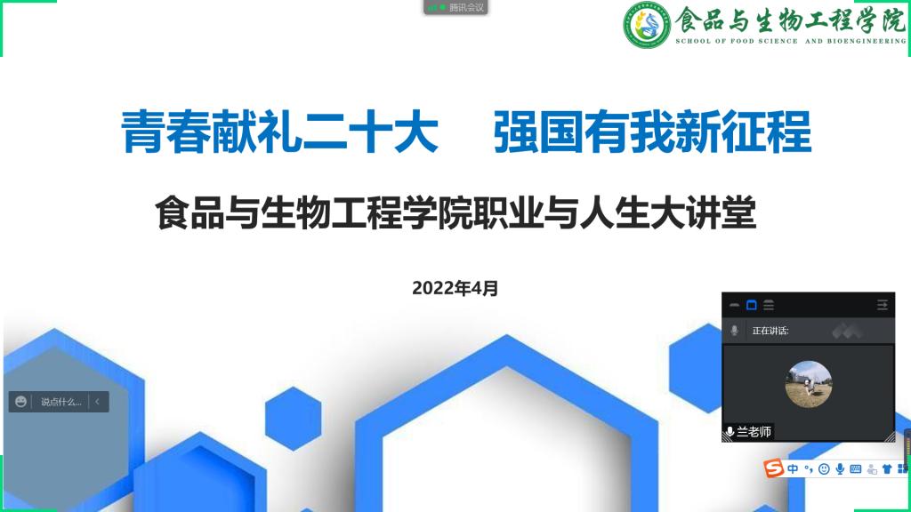 为进一步加强学院学生职业认知能力和规划水平,帮助学生认识专业及未来发展,树立正确的求职目标,4月4日晚19:30,食品学院以线上形式举行了以“青春献礼二十大,强国有我新征程”为主题的职业与人生大讲堂活动,此次活动由就业辅导员兰贵辉主持,学院2014级优秀校友刘涛作为嘉宾进行了专题分享,学院2021级新生在自习教室集体观看,其他年级学生及研究生自主线上参与,共计近400人参加。