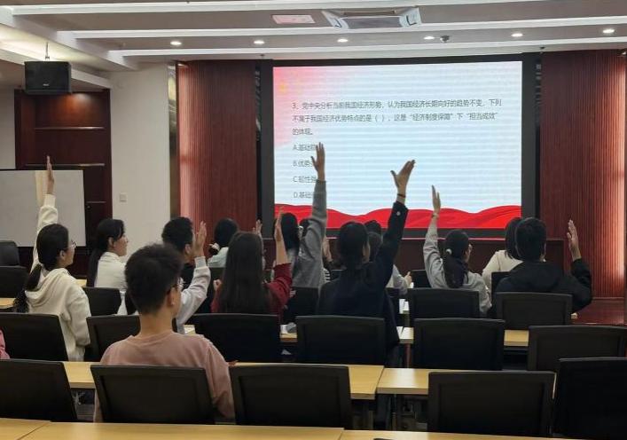 知识抢答环节紧扣2025年“两重两新”任务、党的二十届三中全会“有效市场”论述、我国基本经济制度等热点话题,各小组你追我赶,现场掌声此起彼伏,很好的展示了同学们扎实的理论功底。