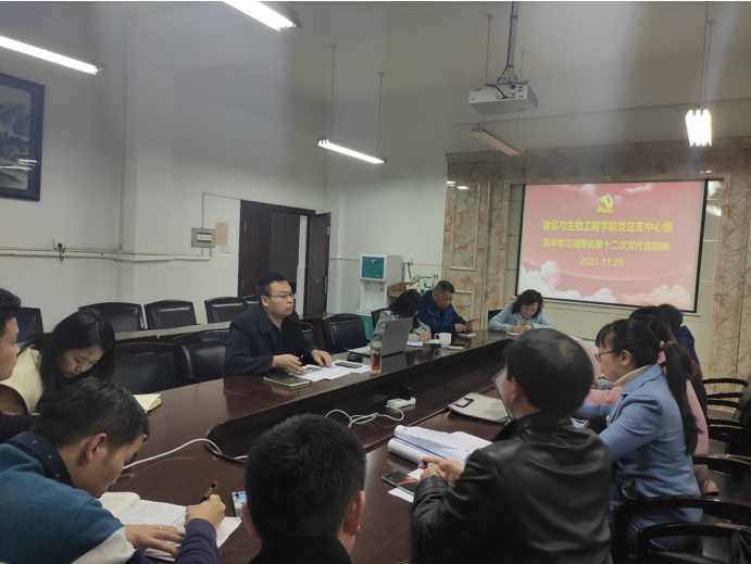 2021年11月29日下午2:30,学院中心组组织集中学习湖南省第十二次党代会精神,院党总支负责人王建辉主持,院领导班子成员、支部书记、系主任参加学习。