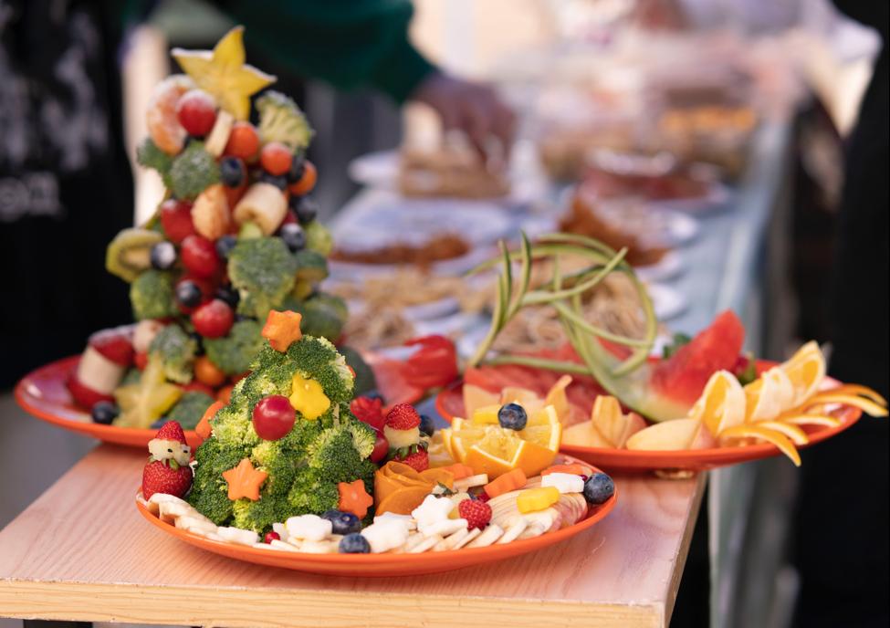 果蔬拼盘玲琅满目,刀工比赛妙手生花……在美食联展活动区,十支入围决赛的队伍同台展示厨艺。队员们精心准备的莆田卤面、血酱鸭、平遥牛肉、海鲜焖子、驴打滚等地方特色美食飘香四溢,令人垂涎欲滴,吸引同学们驻足品尝。美食交换坪前排起长队,同学们一起分享舌尖上的美食,现场还搭建品酒等特色展位,食品学院师生则亲手制作纸杯蛋糕,邀请师生共同享受新鲜出炉的美味。