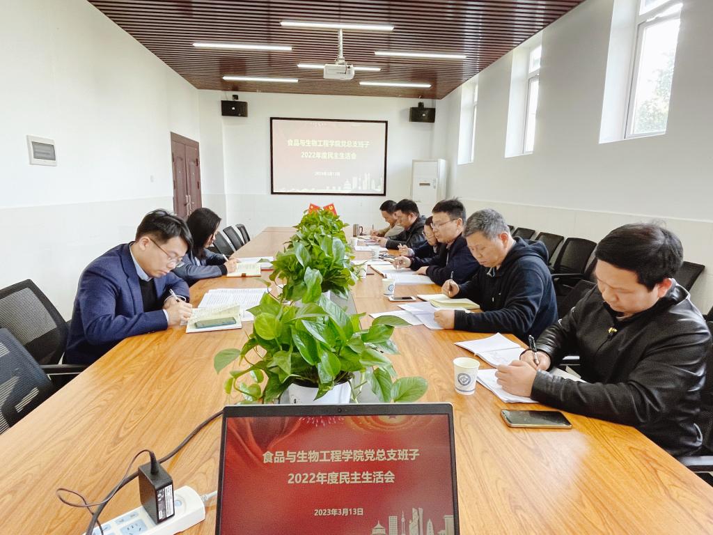 3月13日下午,食品与生物工程学院党总支在工三A349会议室召开2022年度民主生活会,会议在主管副校长钱国平同志、组织部副部长李芳瑾同志的指导下进行。会议由院党总支书记王建辉同志主持,党总支全体委员参加,副院长许宙列席。