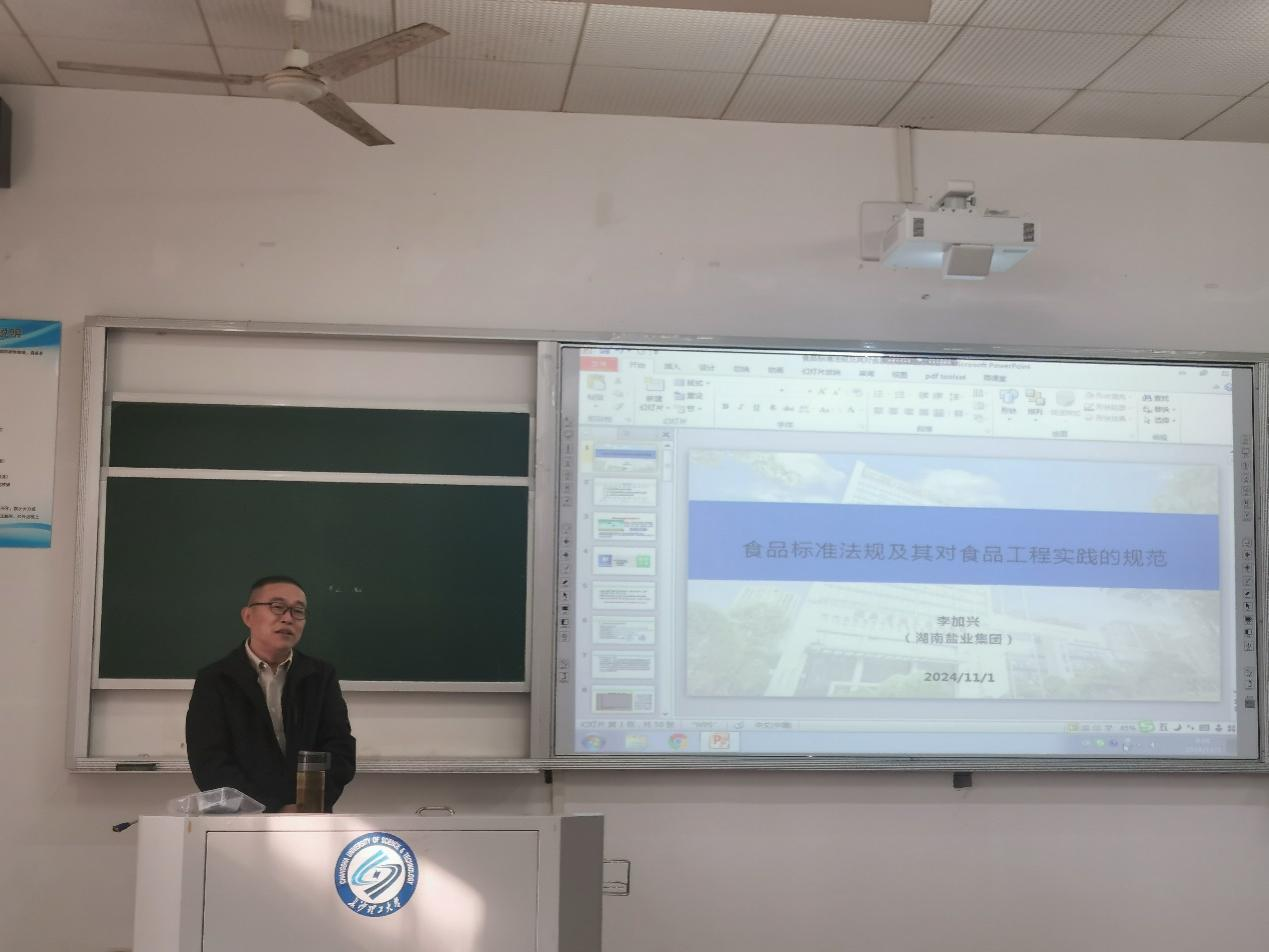 为拓宽学生的专业视野,提升学生对食品行业的认知水平,增强安全意识,引导学生树立专业认同感和职业责任感,为职业发展和未来就业奠定坚实的基础,2024年11月1日,我院邀请了威廉体育williamhill优秀校友、湖南省轻工盐业集团有限公司(简称“盐业集团”)技术中心原首席专家李加兴教授为正在进行认识实习的22级食品科学与工程专业学生做“食品标准法规及其对食品工程实践的规范”专题讲座。本次讲座由学院教授委员会主任易翠平教授主持,22级食品科学与工程专业120多名学生参会。
