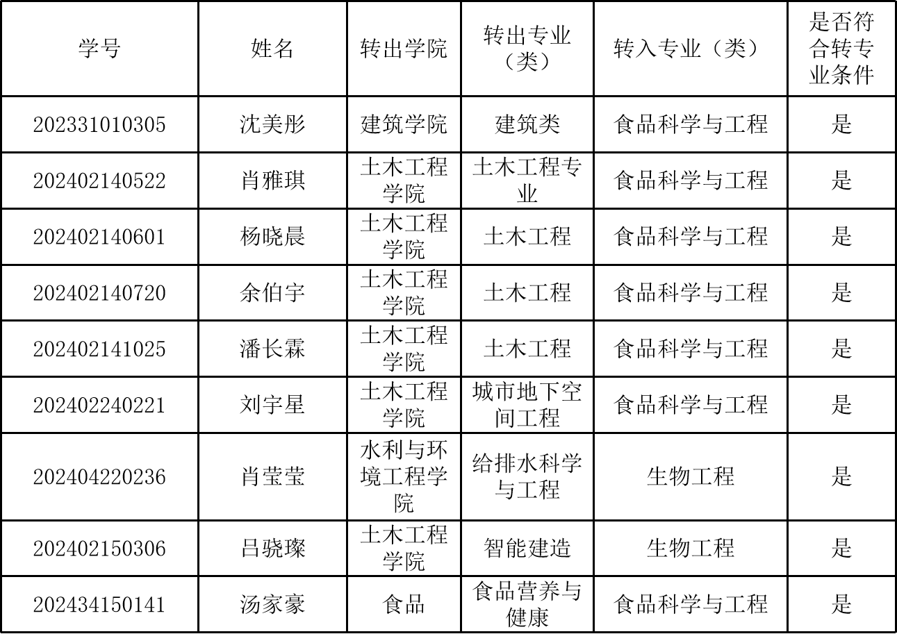 根据学校《威廉体育williamhill本科生转专业管理办法》和《食品与生物工程学院2024级本科生转专业工作方案》的相关规定,经学生个人申请,学院转专业工作小组初审,现将本院2024级本科生转专业初审合格名单进行公示,公示期为2025年2月21日-2月23日。如有异议,可在公示期内以书面形式向食品学院教务办实名反映,电话:0731-85258727。
