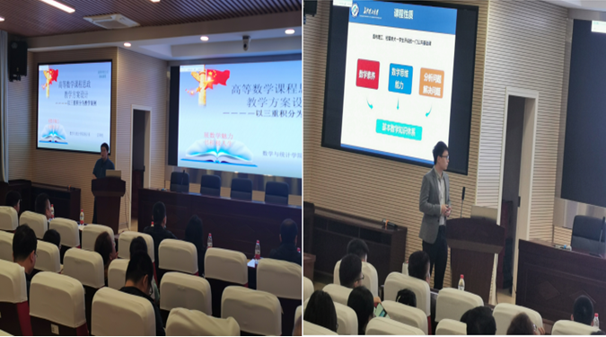 活动中,罗繁荣主任从目标达成度、学生参与度、创新发展度、课程育人度、持续改进度、教学幸福度六个方面介绍如何上好一堂课。接着,数统学院汪和松、赵勇两位教师进行了课程思政教学展示,罗繁荣主任进行总结点评并就课程思政展开了讨论,以及就如何将信息技术更好地运用到教学中和在场的老师进行了交流。
