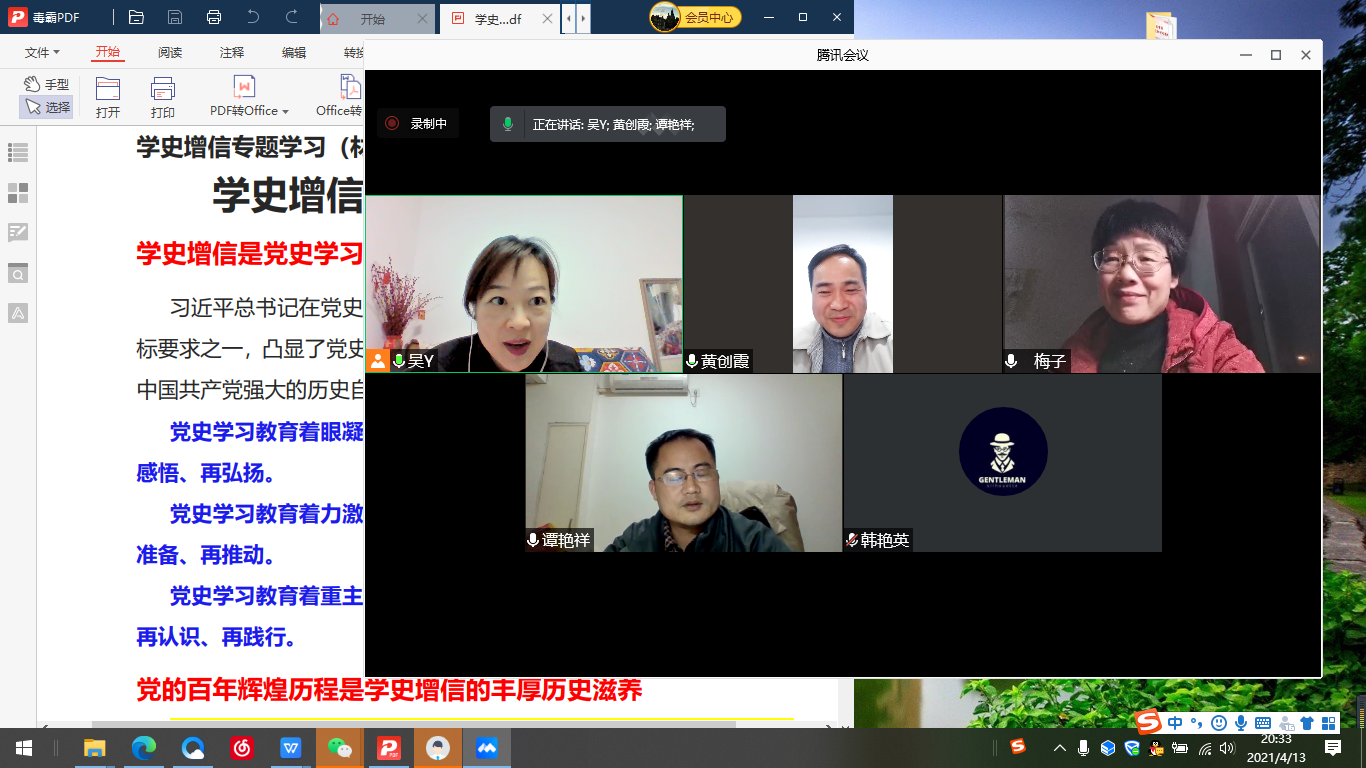 4月13日晚,公数支部通过云会议集体进行了“学史增信”专题板块的学习与交流讨论。会议由支部书记吴烨主持,全体党员到会,集中学习党史学习教育的内涵。