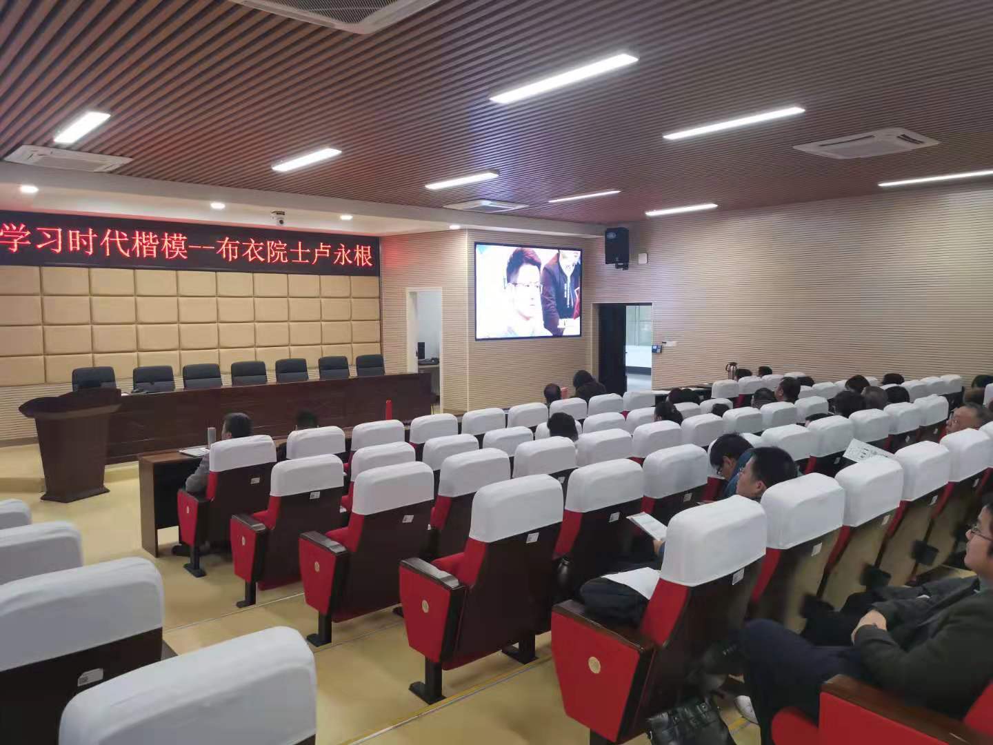 12月17日下午,数学与统计学院组织全体教师在理科楼A200学习“时代楷模”布衣院士卢永根同志的先进事迹。