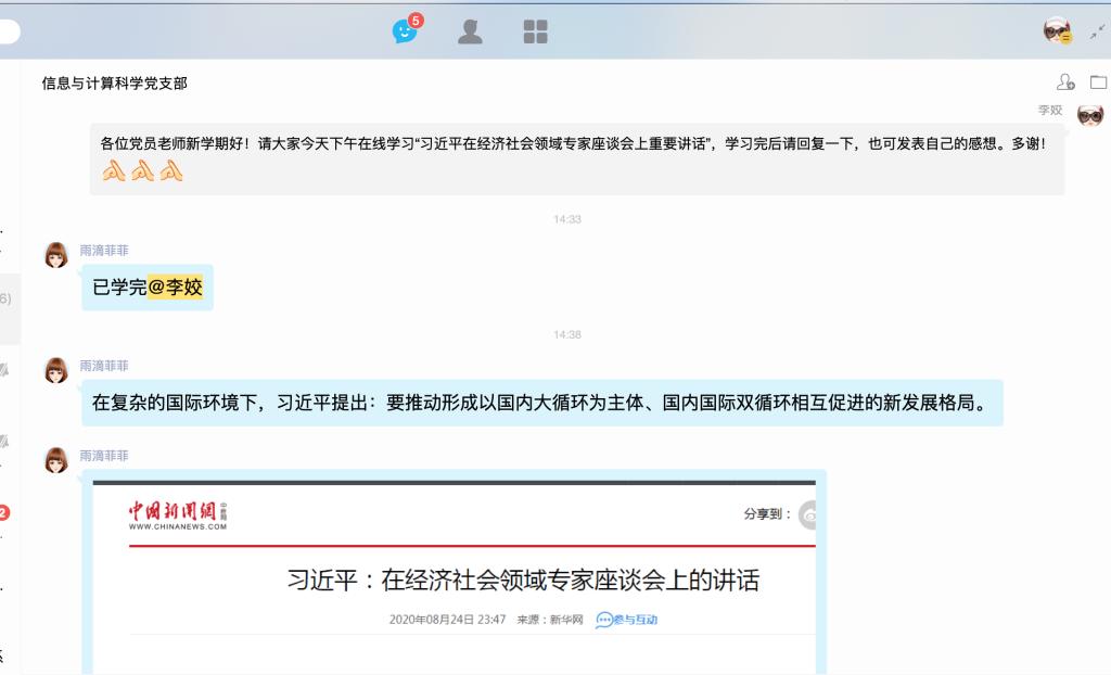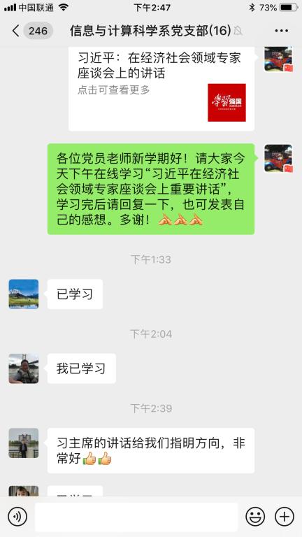 9月4日下午,信息与计算科学系党支部通过支部微信群和QQ群在线集中学习研讨了“习近平在经济社会领域专家座谈会上重要讲话”。