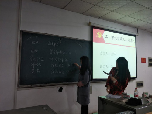首先由支部书记刘维维代表支部委员会作党支部工作报告,报告中回顾总结了过去年支部开展的工作,并对党支部下一步的工作提出了意见和期望;接着支部书记刘维维宣读换届选举办法、公布候选人名单计票人、监票。大会表决通过了《大会选举办法》及监票人、计票人名单。介绍了支委委员候选人基本情况后,投票开始正式。