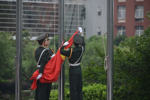 活动伊始,国旗班班长刘达宣布升旗仪式正式开始,并在其组织下升旗并奏唱国歌。紧接着,全体到场人员面向国旗庄严宣誓。宣誓完毕后,全体人员在指挥及领唱的带领下合唱《我和我的祖国》,为新中国70周年献礼。随后,马丽对参加升旗仪式的同学们提出期望,她强调现已进入考试月,同学们应早睡早起,合理安排时间,抓紧复习,争取在期末考试中取得优异成绩。同时也提醒同学们应多参加至户外活动,劳逸结合,在复习的同时勿忘锻炼身体,养成良好的生活习惯。活动圆满结束。