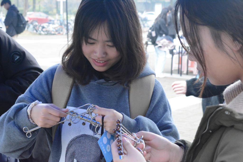 活动分为文化活动、数学模型体验、数学游戏乐园三个模块。在文化活动中,“党的二十大精神”和“全国两会精神”遇上成语接龙等项目精彩纷呈,同学们积极参与,观众们也连声称赞。数学模型的体验让同学们更深刻地认识到自己与“π”的关系,而数学游戏乐园则将数学与有趣的游戏相结合,华容道、九连环、魔方等游戏令人目不暇接。在游戏过程中,同学们既有遇到难题时的困惑,也有解决问题后的兴奋。
