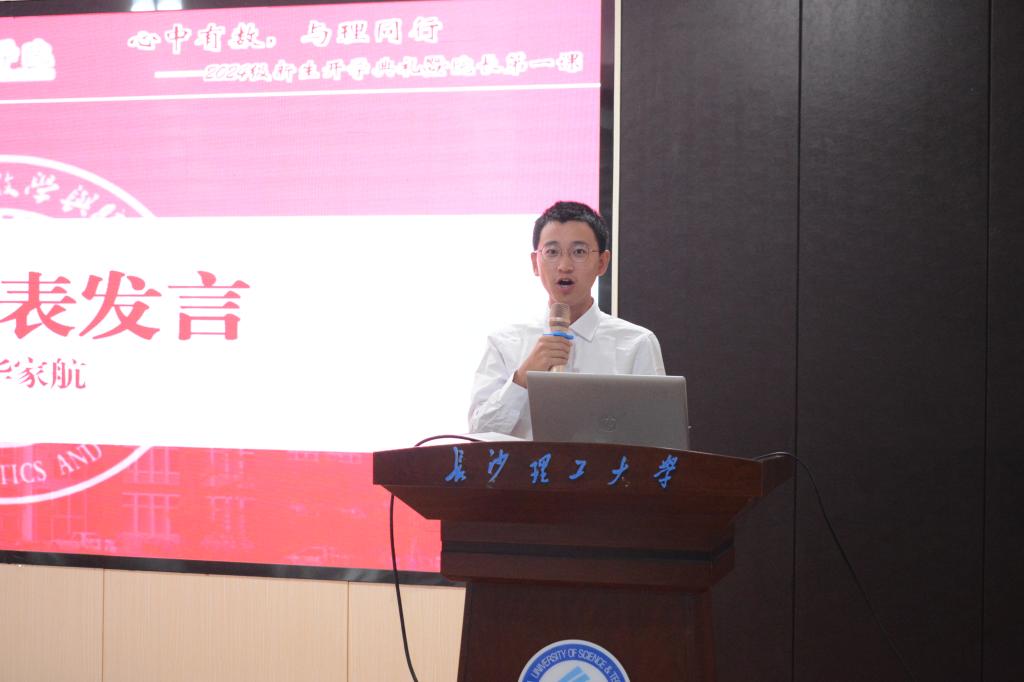 新生代表华家航表达了对学校的感激与对大学生活的期待之情。他呼吁全体新生努力学习的同时积极参与各类实践活动,不断提升个人综合素质和社会责任感,以青春之我,为青春之国家、青春之民族贡献力量