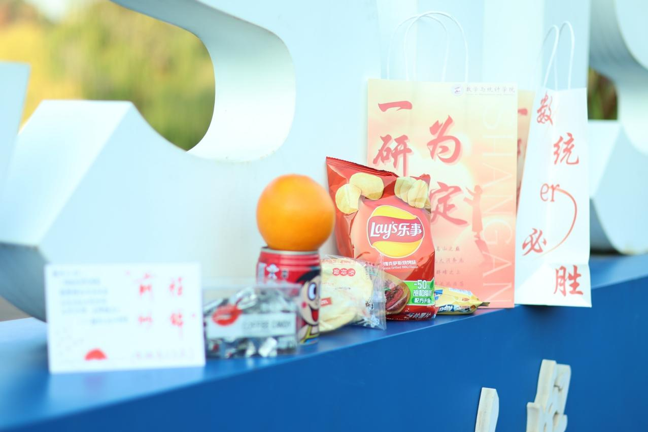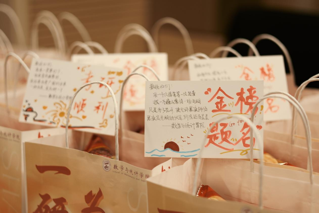“金榜题名墨尚新,今年依旧去年春”。件件贴心的礼物,句句真切的话语,都是数统学院对考研学子深深的爱与温暖。“数统er必胜”的福袋,“一研为定”的数统特制明信片,心想事“橙”的橙子,运旺时盛的旺仔牛奶与旺旺雪饼和仙贝,“棒”上有名的棒棒糖等,都是每一位老师对学生最诚挚的祝福。