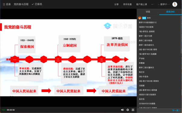 第一课由李伟教授从我们党的奋斗目标、中华民族从1840年以来是怎么走向辉煌的和改革开放,强国之路三个方面讲述党的奋斗历程,在授课过程中李伟也结合湖湘历史文化,让大家更清晰地了解党的辉煌历史。他指出:以史为鉴可以知兴替,如今我们也处于全面建成小康社会的关键阶段,更应该不断反思,努力建设国家。必须正确认识近代世界的新鲜事物,在辛亥革命中我们推翻了两千多年的封建帝制、十月革命将社会主义送进了中国,五四运动的爆发,将民主科学的思想传入了中国。中国共产党在1921年正式成立,并且在毛泽东同志的正确领导下开辟了一条适合中国国情的社会主义道路,此次中国抗疫的成功就很好的体现出了中国特色社会主义制度的优越性,以及我们党对自身的不断完善。