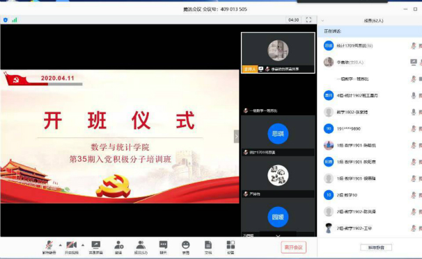 2020年4月11日下午,数学与统计学院举行了第35期入党积极分子培训班开班典礼,班主任柳映堂及第35期入党积极分子参加。