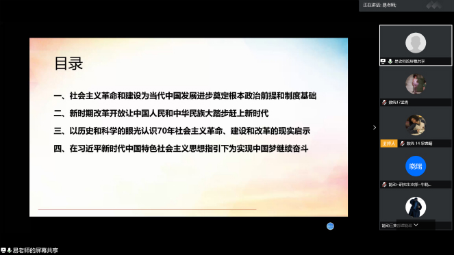 课程一开始,易显飞教授通过三个视频带领我们回顾了新中国成立70周年来的伟大成就。课上,易显飞教授分别从社会主义革命和建设为当代中国发展进步奠定根本政治前提和制度基础、新时期改革开放让中国人民和中华民族大踏步赶上新时代、以历史和科学的眼光认识70周年社会主义革命、建设和改革的现实启示、在习近平新时代中国特色社会主义思想指引下为实现中国梦继续奋斗四个方面向我们详细介绍了新中国成立70周年以来的成就与历史经验。易显飞教授表示:“70年的峥嵘岁月,70年的玉汝于成,是中国共产党团结带领中国人民完成了社会主义革命,确立了社会主义制度,成功推进了社会主义建设和改革开放的伟大革命,进而开辟了具有中国特色的社会主义道路”。
