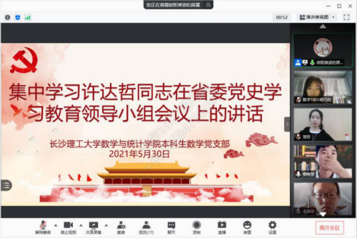 5月30日上午10点,数统学院本科生数学党支部在腾讯会议上集中学习许达哲同志在省委党史学习教育领导小组会议上的讲话,会议由欧阳美姿同志主持,全体党员参加。
