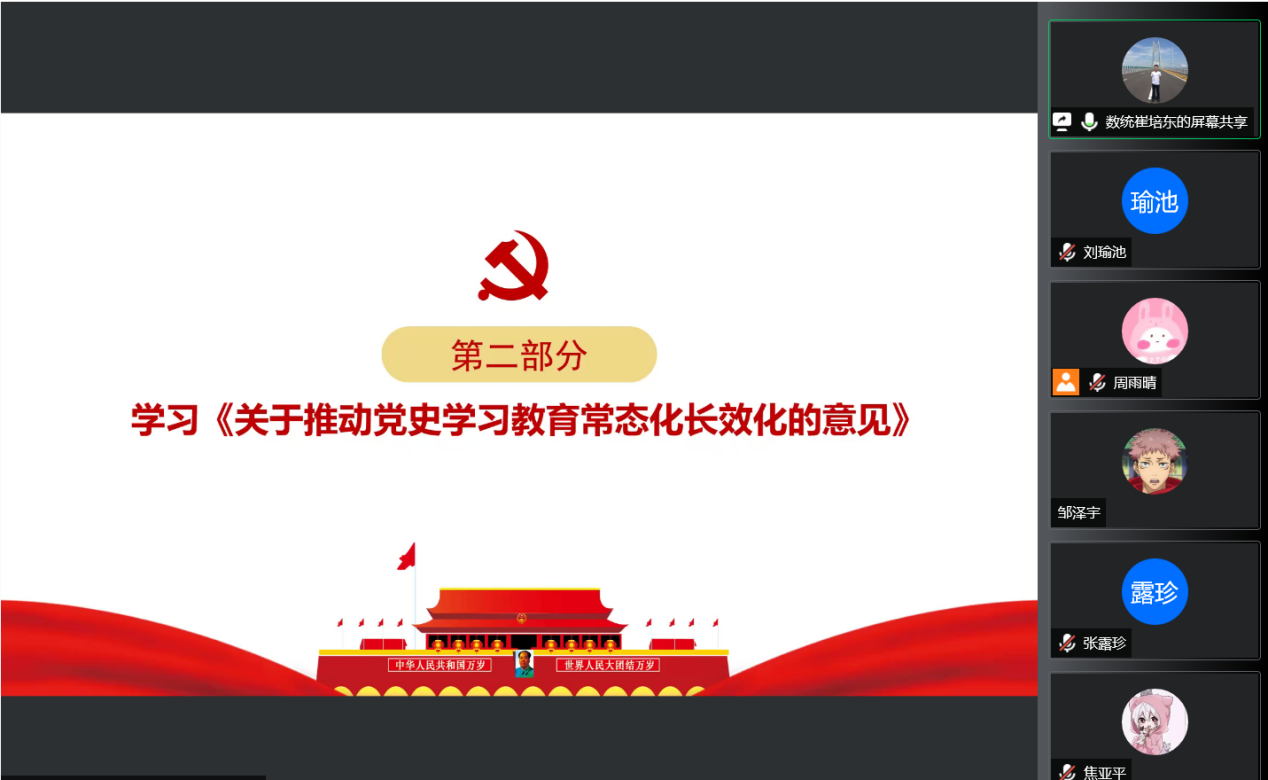 各支部负责人带领党员同志学习《关于推动党史学习教育常态化长效化的意见》、《威廉体育williamhill2022年宣传思想工作要点》和《党员学习手册》等内容。从着眼坚定历史自信、着眼增强理论自觉、着眼提高政治能力、强化宗旨意识、激发昂扬斗志、永葆初心使命六个具体方面展开叙述。深入学习2022年学校宣传思想工作的指导思想和四大宣传思想工作要点,要高举旗帜、牢记使命,坚定捍卫“两个确立”,坚决确保意识形态安全,凝练长理精神,深化文明创建。