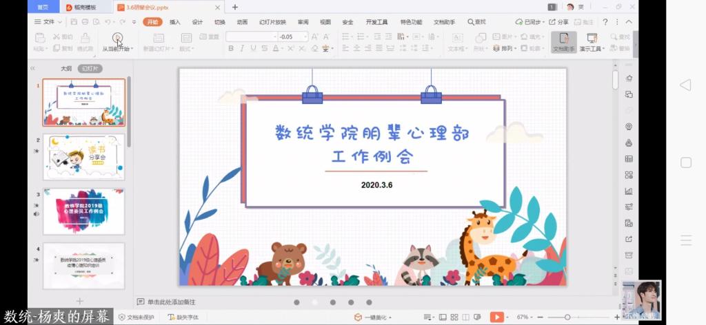 3月6日晚上6点30,数统学院开展心理部本学期第一次线上部门例会。本次例会由学院心理辅导员杨爽和部长杨巧玲共同主持,心理部全体成员参加。