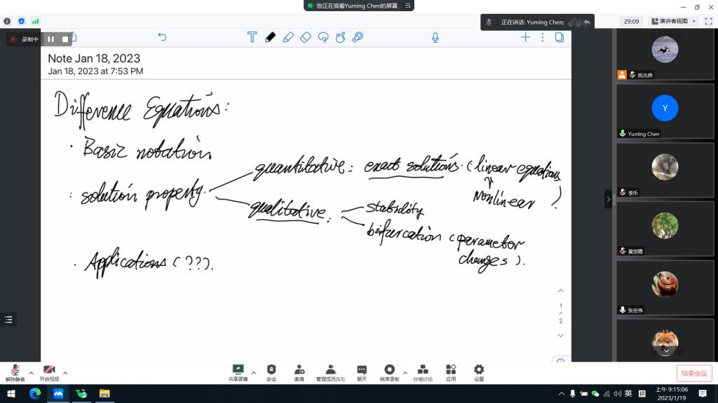 为提高学生的学习兴趣,丰富大家的课程选择,1月19日,数统学院省级研究生联合培养基地在寒假期间特邀加拿大罗瑞尔大学著名学者陈玉明教授为我院开设系列国际课程《差分方程》,共分六次进行。