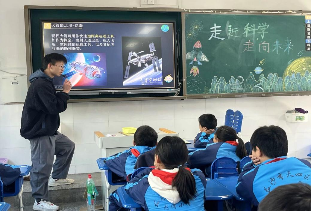 “什么是火箭?火箭为什么能飞?火箭的发明者是谁?”课堂上,大学生志愿者吴进通过PPT展示,深入浅出地向小朋友们依次讲解了火箭的类型,火箭升空的原理,中国火箭发展历程、用途与成就等,重点讲述了中国火箭梦想和水火箭升空的原理与制作步骤。课堂通过问答、游戏互动等寓教于乐的形式,让小朋友积极参与其中。大学生志愿者谭斌向小朋友们展示了他们精心制作的水火箭模型,详细介绍了其发射原理,并指导小朋友们如何自己动手制作水火箭模型,充分激发了孩子们的好奇心和创造力。