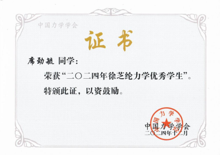 席劲毓同学对力学有着浓厚兴趣,在校学习期间成绩优异,本科课程平均绩点和最终综合测评均为专业第一,尤其力学课程平均分高达95.25;积极参加各类学科竞赛,曾获第十四届全国周培源大学生力学竞赛个人赛二等奖、第十九届湖南省力学竞赛一等奖(全省第八)、第十四届全国周培源大学生力学竞赛基础力学实验团体赛优胜奖、两次获国家励志奖学金、校级“百优大学生”等荣誉。