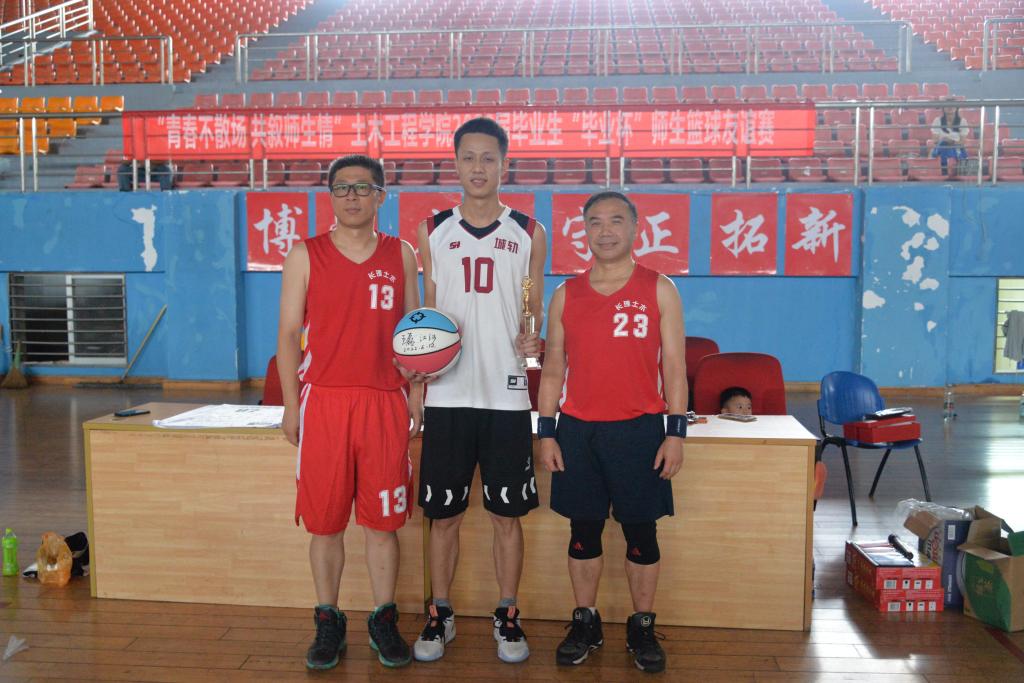 中场时刻,现场举行了师生三分球投篮大赛和毕业签名球衣赠送仪式。三分投篮大赛分教工队和学生队,每队派出三名队员参赛,参赛选手要分五处定点投篮,在两分钟内投完10个球,累计进球数最多为胜者。最终,本科生代表队杨川同学以6球的优异成绩荣获“三分王”。在毕业签名球衣赠送环节,全体教师球员逐一在纪念球衣和篮球上签字,江河和王磊代表学院向毕业生代表赠送了签名球衣和篮球,并合影留念,寄托了学院对2022届全体毕业生早日成才的祝福和期望!