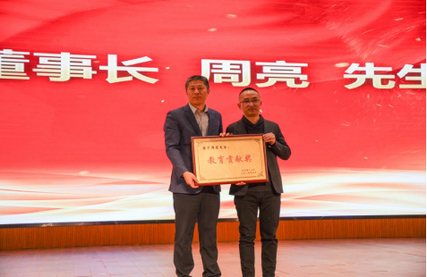 深圳市九象数字科技有限公司董事长兼总经理周亮致辞。周亮首先介绍了近十几年来土木行业的发展情况,随后他结合自身经历勉励同学们要打好自身专业基础,在学习的海洋里广泛涉猎,提高自身的工作能力、判断能力、组织能力和协调能力,从多方面提升自己。同时,他希望大家提升抗打击能力,敢于面对挫折,找到属于自己的专长,全面提升综合能力和核心竞争力。随后,土木工程学院院长王磊教授为周亮颁发教育贡献奖奖牌,代表学院对周亮校友心系母校,胸怀教育梦想表示感谢。