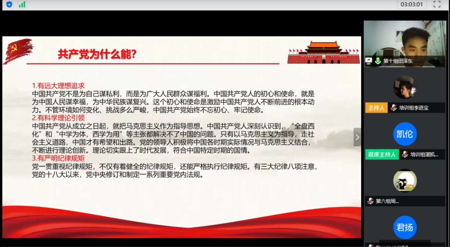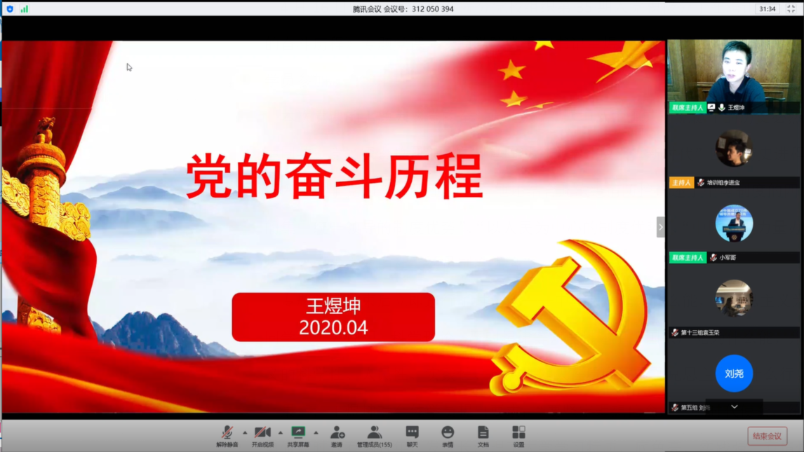 4月19日晚,土木工程学院分党校组织第35期入党积极分子在腾讯会议平台上开展《党的奋斗历程》专题党课,交通学院党委副书记王煜坤应邀主讲,学生党总支副书记李小军及第35期入党积极分子全体学员参加。