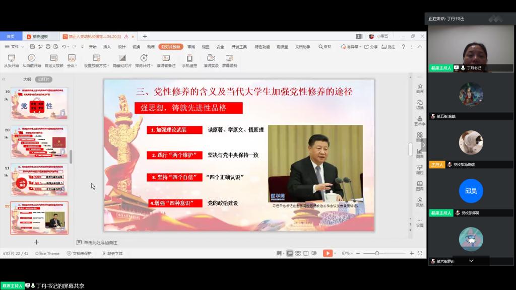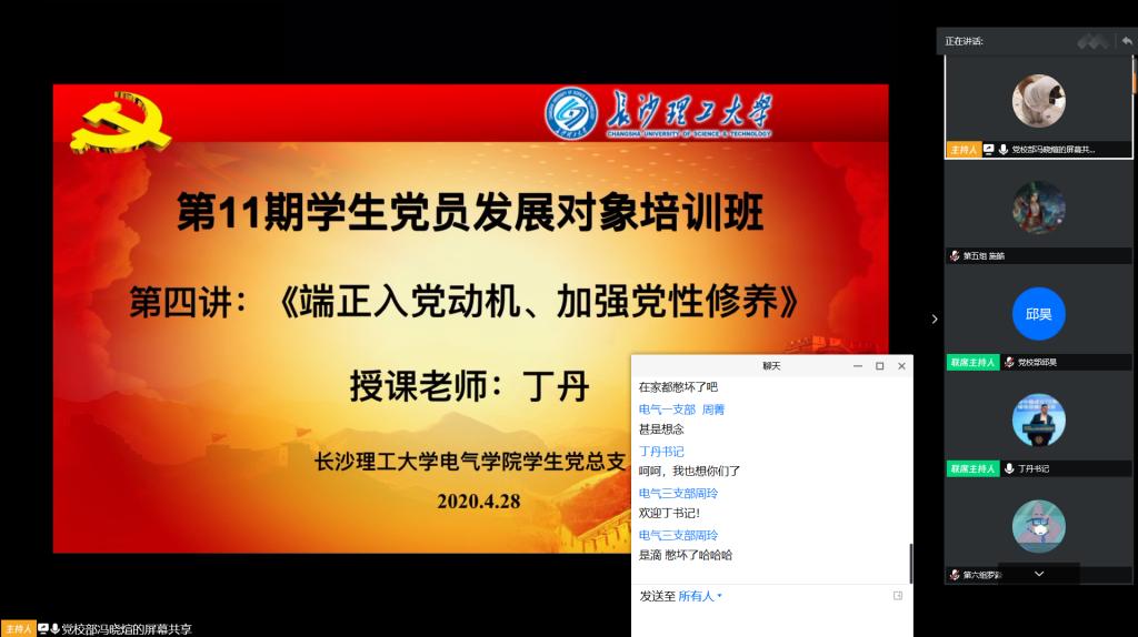 丁丹从“端正入党动机的含义及其重要意义”、“当代大学生不良入党动机及其纠正”、“党性修养的含义及当代大学生加强党性修养的途径”以及“共产党人的初心和使命是什么”四个方面进行授课。她强调,我们要为了更好地为人民服务而入党,身为学生干部,要为了更好地同学服务而入党。共产党人要有起先锋模范的思想觉悟,在疫情期间敢担当、有担当就是最好的表现。她谈到,疫情是面“照妖镜”,照出了许多党员干部的真面目,有些党员畏手畏脚,不敢冲上去,但更多的党员干部“关键时刻冲得上去,危难关头豁得出来”,她鼓励大家向身边的优秀党员学习,如向武汉多次捐款的土木教师黄戡,冲锋疫情防控一线的土木在读研究生邹磊等榜样学习他们的责任与担当。