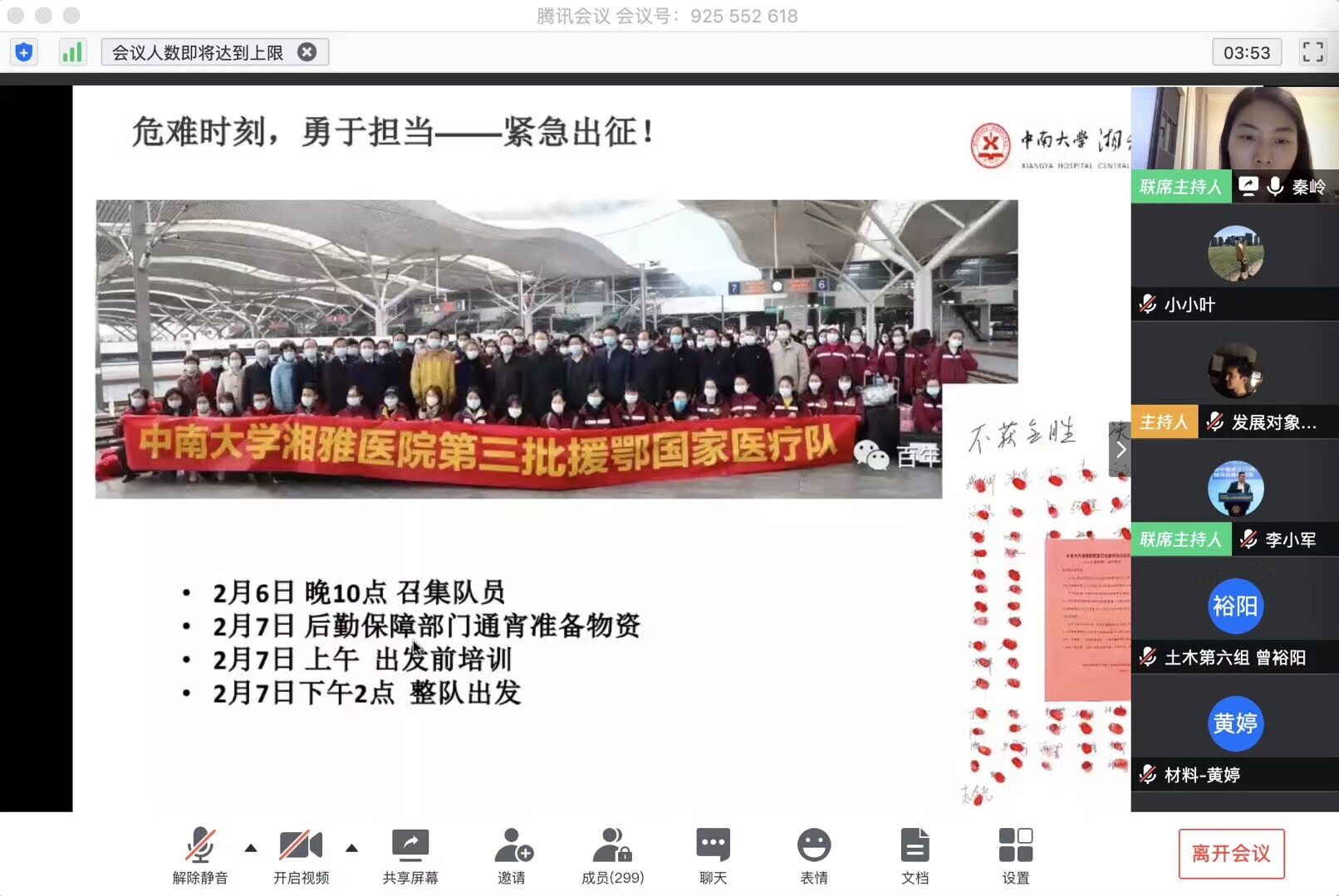 为深入学习领会习近平总书记关于疫情防控工作的重要指示精神,做好2020年春季学生开学准备工作。5月7日晚,土木工程学院特邀“最美逆行者”——中南大学湘雅医院援鄂医疗队副主任医师秦岭做客“党员先锋说”(第二期)活动,以直播的方式,为学院师生党员上了一堂触及灵魂深处的特殊党课。学生党总支副书记李小军主持学习,院党委副书记黄阿明,院团委书记綦丽、学工办叶正芳、董治佑老师和学生党员代表共计300人聆听了这堂特殊的思政大课。