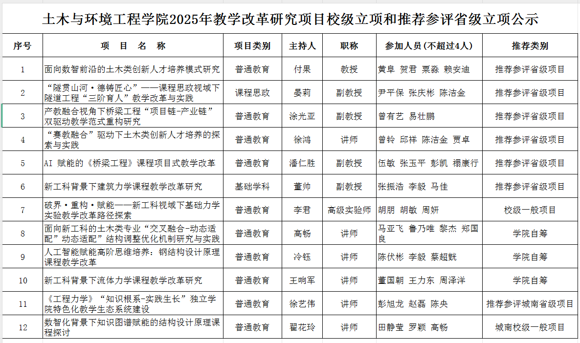 根据学校《关于开展2025年教学改革研究项目立项和结题工作的通知》的要求,经教师个人申报,学院组织专家评审推荐,现将2025年教学改革研究项目校级立项和推荐参评省级立项名单予以公示,公示期为3天(2025年4月18日-4月20日),如有异议,请在公示期内向学院教务办反映,地点:工科二号楼A417,电话:85256007。