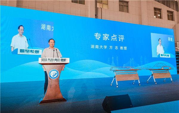 9日下午举行的闭幕式上,评委专家组组长方志教授结合部分优秀作品展示对大赛进行了点评。他表示,本次竞赛选题桥梁悬臂跨距很大,设计难度很高,对参赛选手的计算、制作都有了更大的挑战,最终作品呈现出了非常多元的结构体系,参赛选手展现出的创新能力和动手实践能力让人惊叹。