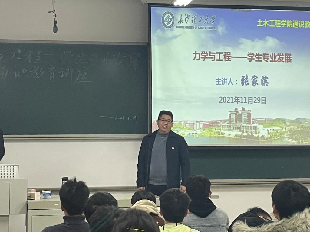 为进一步落实学院专业认证人才培养计划,提升工科学生的综合素质,了解专业发展方向,11月29日晚,土木工程学院在工科三号楼A-208教师举行了题为“力学与工程—学生专业发展”的通识教育讲座。力学系张家滨博士应邀主讲。桥梁及力学专业学生代表100多人参加讲座,讲座由学工办李小军老师主持。