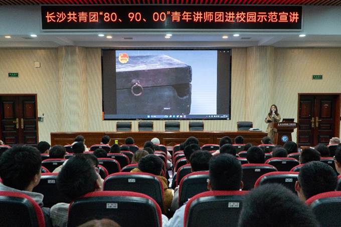 11月17日晚,长沙共青团“80、90、00”青年讲师团讲师、长沙市雅礼外国语学校团委书记席慕晴在工科二号楼B302,以“枕头箱的故事”为题开展主题宣讲,带领2025级新生重温革命岁月,感悟信仰的磅礴力量。