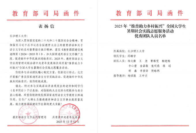 近日,教育部语言文字应用管理司与共青团中央青年发展部联合评选的2025年“推普助力乡村振兴”全国大学生暑期社会实践志愿服务活动优秀团队评选结果公布,由学院2024级本科生邱鹏宇领队,杨琪毅和王中兴老师指导的“墨韵知行”团队从全国8013支团队中脱颖而出,入选重点团队并获“优秀团队”称号,教育部语言文字应用管理司与共青团中央青年发展部联合发来表扬信。