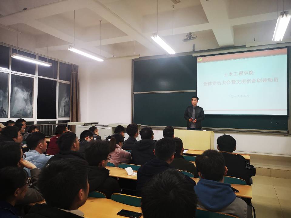 王煜坤对全体党员作文明宿舍创建动员。他带领全体党员重温了党章规定的八项义务和权利,结合党的十九大报告、全国教育大会精神向全体党员阐述了青年大学生养成教育的重要意义,解读了学校2019年工作要点中关于开展文明寝室创建要求,他强调全体党员要时刻保持党员优秀意识,在学院文明宿舍创建中充分发挥先锋模范作用。