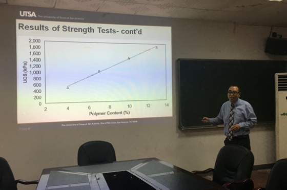 Jie HUANG副教授结合自身的研究经历,先分享了能量桩的发展历程、研究现状、能量传递机理以及应用前景;接着,详细讲解了利用聚合物处理高液限软土地基的方法及条件。与会师生认真聆听了报告,并与Jie HUANG副教授深入探讨了能量桩的工作效率、聚合物处治软土地基的施工工艺、环保效应以及经济性等关键问题。