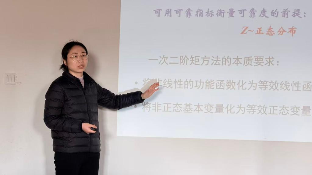 三位青年教师依次进行了教学展示。李毅老师围绕《钢结构设计原理》课程,讲解了“受弯构件的强度计算”相关内容,逻辑清晰,公式推导严谨。彭琦老师以《房屋建筑学》课程为基础,深入浅出地辨析了“建筑工业化”、“工业化建筑”与“装配式建筑”三个关键概念之间的逻辑联系与内涵演变。冷钰老师针对《荷载与结构设计方法》中的难点,系统讲解了“结构可靠度分析的中心点法”,通过清晰的步骤分解阐释了该方法的核心原理。