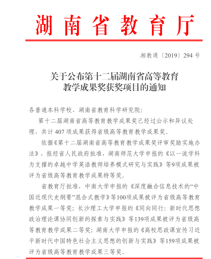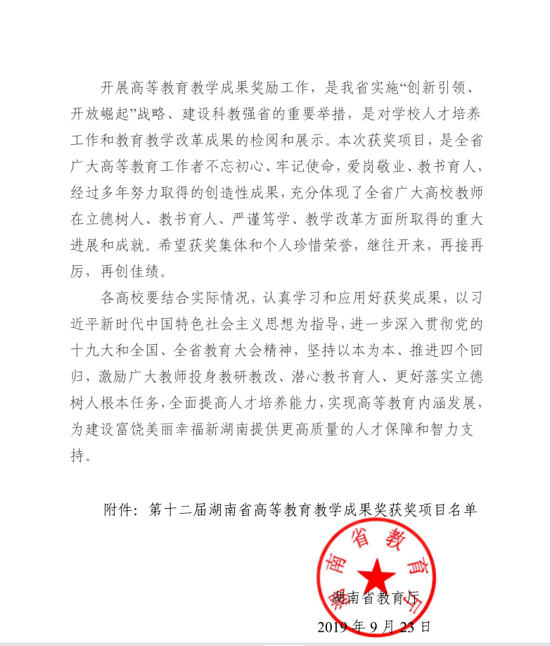 湘教通〔2019〕294号 关于公布第十二届湖南省高等教育教学成果奖获奖项目的通知(1)